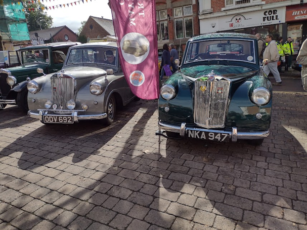 Photo of Paul Burgess’s (NKA 947) and John Castle’s (ODV 692) Mayflowers at Hinckley Town Centre in Hinckley, Leicestershire on Sunday 19th September 2021, next to the club’s banner.